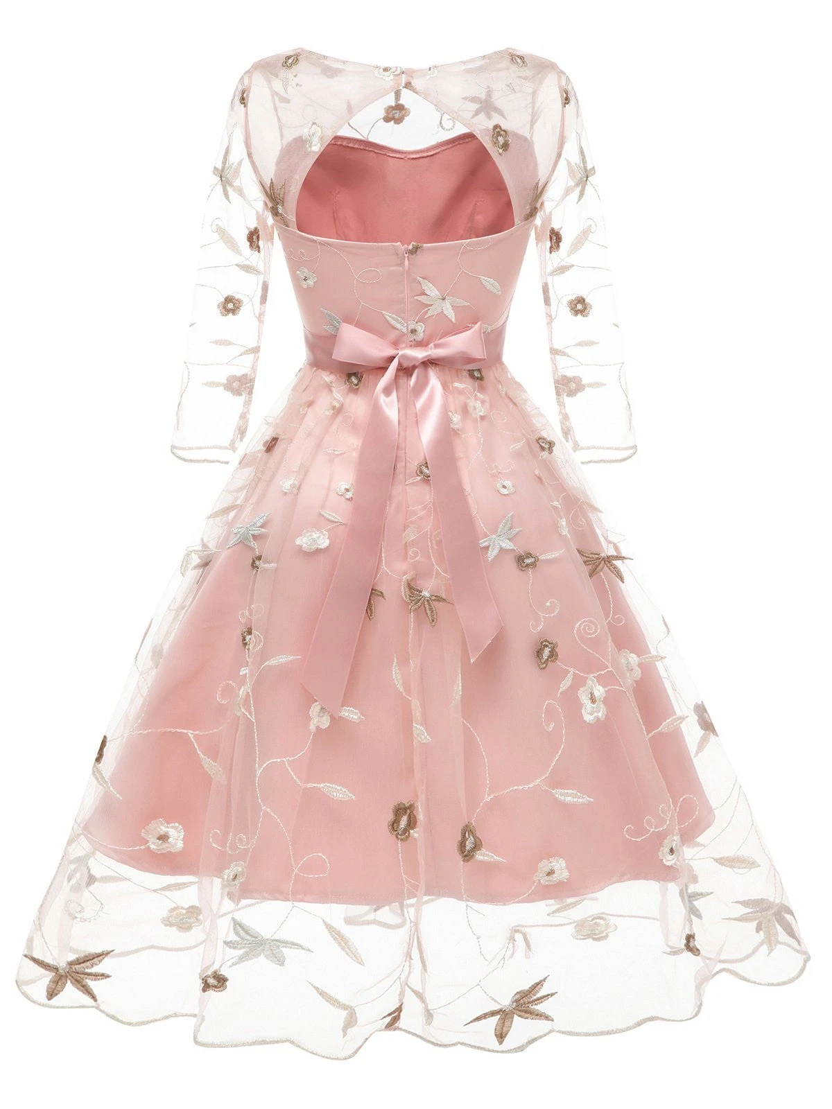 A sweet dress in fabulous 1950s vintage appeal fresh from Retro Stage. This beautiful mid-century styled dress is crafted in lace that twirls with floral embroidery divinity for the modern era through pink and apricot background. Outfitted with a back zipper, it’s a marvelous stunner!